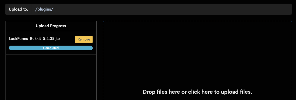 Once you're in the plugins or mods folder, click upload and select the LuckPerms jar you downloaded in Step 1.