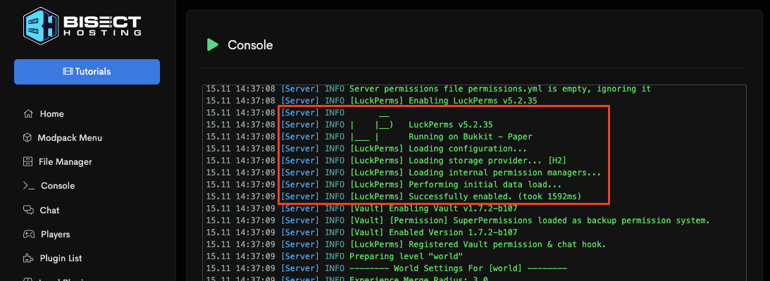 As your server restarts, you can monitor the console to make sure LuckPerms starts up and enables correctly.