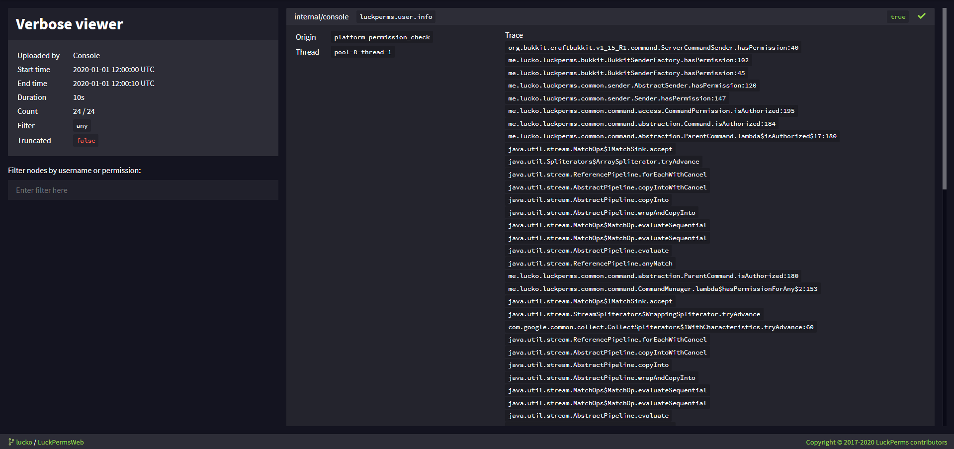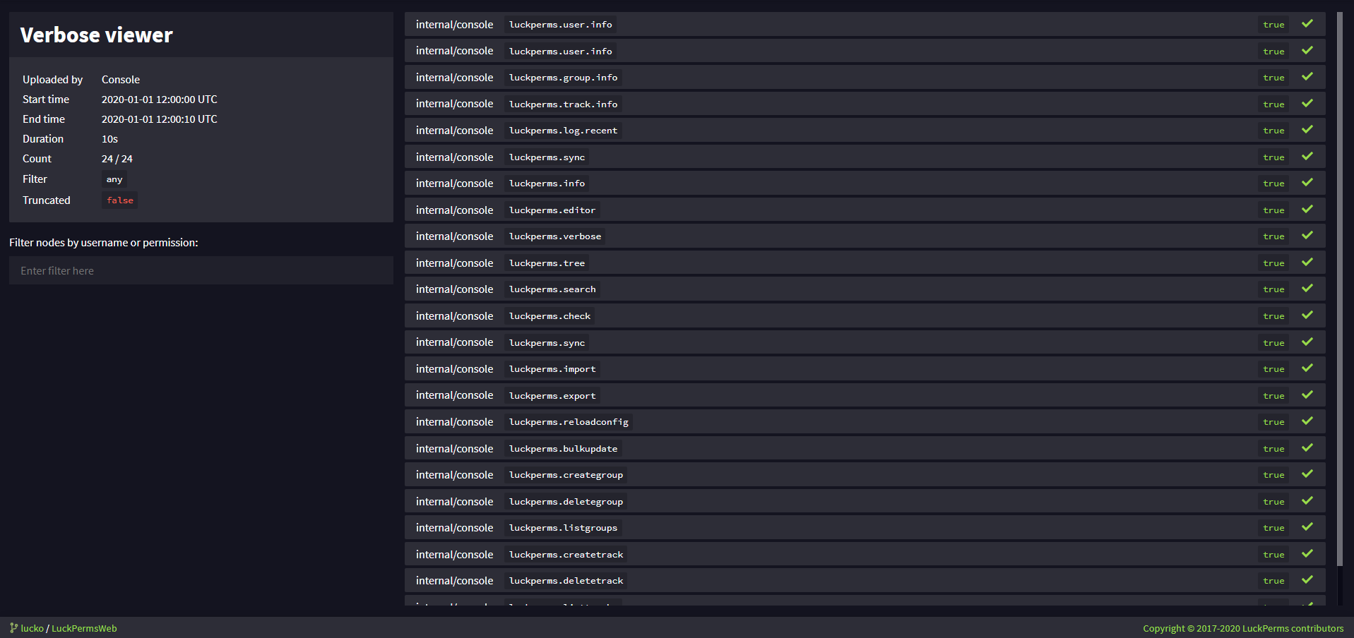 command will send the permission checks to the web-based verbose viewer, instead of to your client as a chat message. To finish recording permission checks and open the web viewer, simply run lp verbose upload